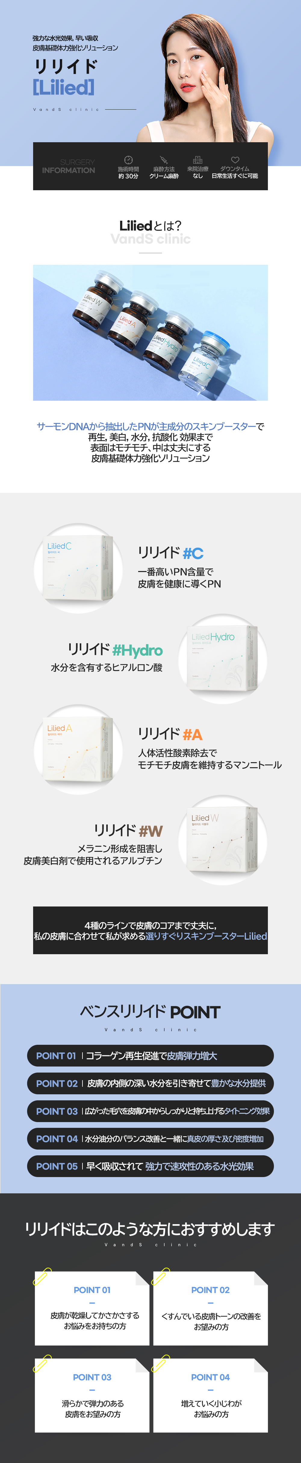 A. 従来のハイジュ水光注射は医薬品ですが、 リリードMはプレミアムヒアルロン酸ナトリウムを含む医療機器・組織修復用生体材料です。厳格な精製プロセスを経て作られた製品で、肌に即座に水分をチャージし、肌内部のコラーゲンを再生することができます。特に吸収が早く、施術後すぐに日常生活が可能です。
